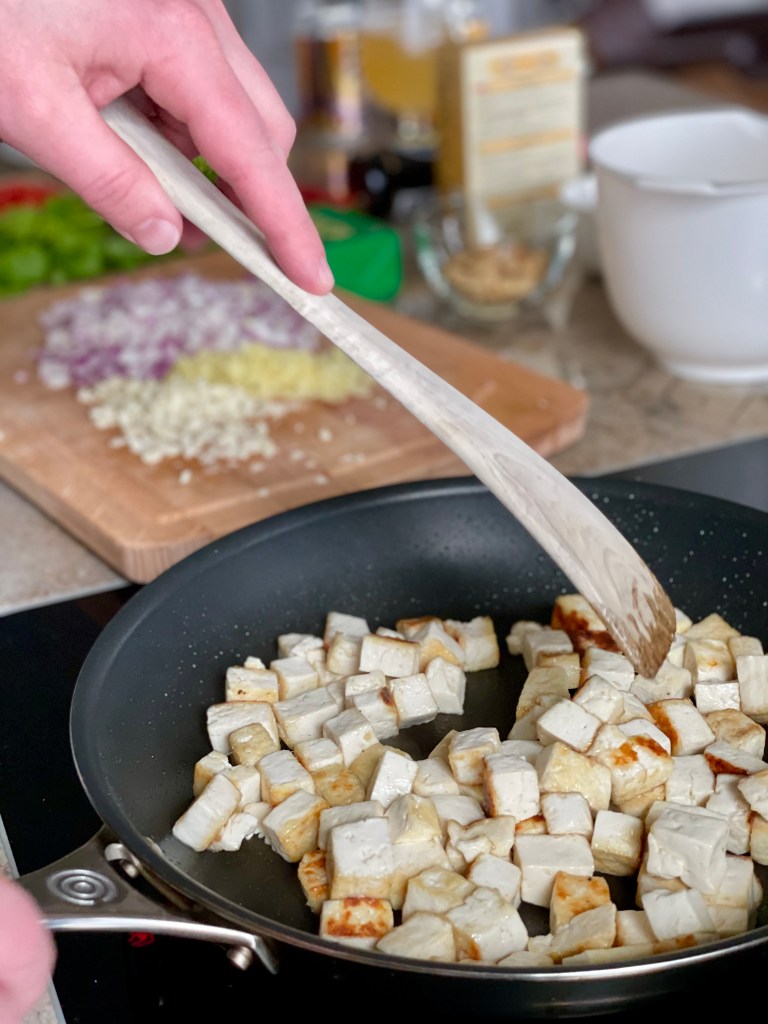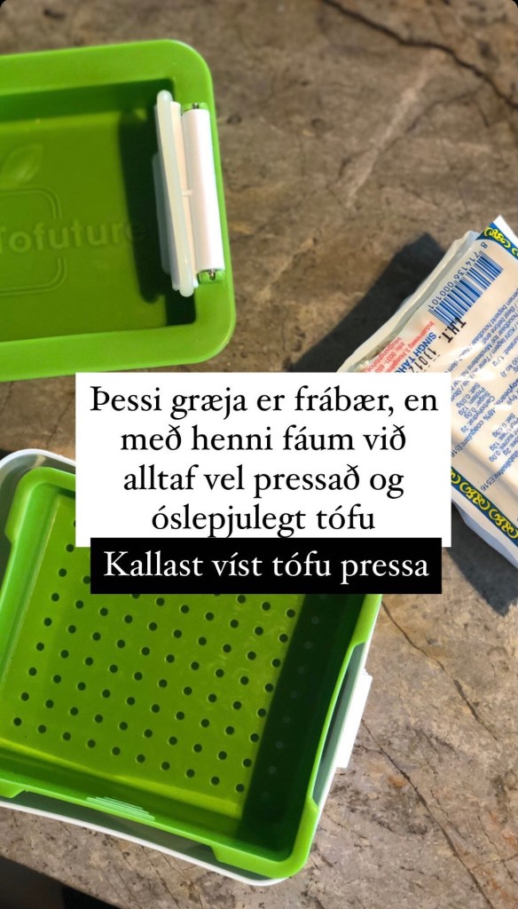 Það er mikilvægt að kreysta allan safa úr tófúinu áður en það er notað. Við eigum það sem kallast tófúpressa sem gjörbreytir leiknum, en áður en við eignuðumst hana þá settum við tófúkubbinn í viskastykki og bækur ofan kubbinn og létum bíða í 20 mín. Ef þið hafið ekki tíma fyrir slíkt þá má alveg nota kubbinn beint, en þá verður áferðin aðeins mýkri.