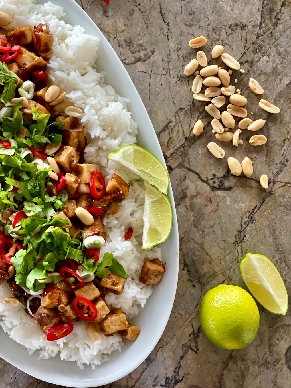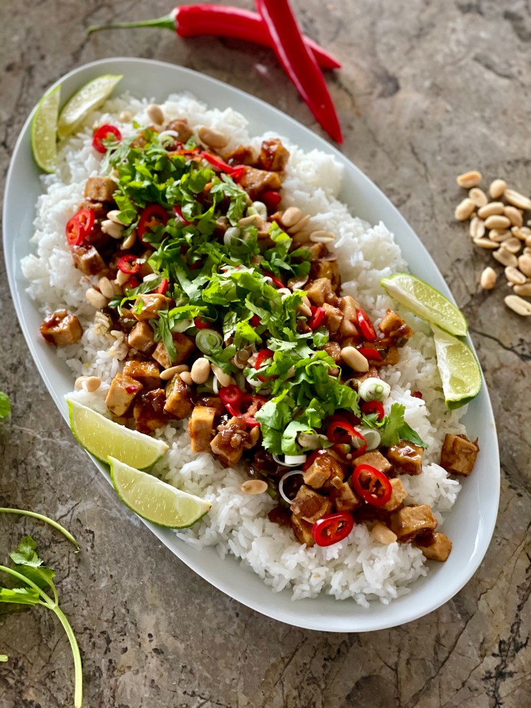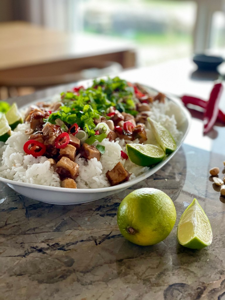 Klístrað tófu á hrísgrjónabeði toppað með vorlauk, kóríander, chili, hnetum og lime.